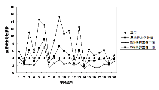 另一方面,從工程意義上講,疲勞分散系數(shù)越大,得到的飛機疲勞安全壽命越安全。因此在一定的誤差范圍內,疲勞分散系數(shù)的估計值稍微大些比較好。由圖9.1~圖9.3可以看出,采用置信上限來近似疲勞分散系數(shù)時,在樣本容量為5、10、15的情況下,置信上限小于真值的組數(shù)分別僅為6、3、0,而通過原始樣本對標準差進行點估計得到的疲勞分散系數(shù)小于真值的組數(shù)分別為11、11、9,由此得到的飛機疲勞安全壽命偏危險的組數(shù)明顯要多于本文方法。從這個意義上講,針對疲勞壽命小子樣統(tǒng)計分析問題,比之于通過對試驗數(shù)據(jù)進行點估計而得到的疲勞分散系數(shù),采用本文方法得到的疲勞分散系數(shù)的置信上限是更為安全的結果。